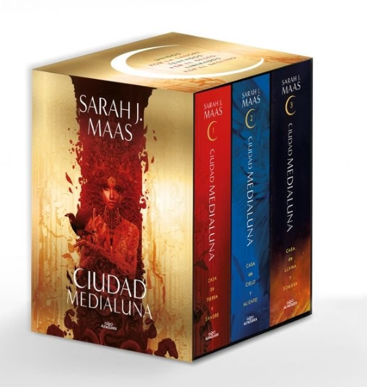 Estuche de la saga best seller Ciudad Medialuna de Sarah J. Maas, la autora internacional de fantasía más vendida. ¡Incluye una ilustración! Una historia de mundos paralelos, criaturas fantásticas, magia, romance, odio y traición… ahora acompañada de una ilustración de Bryce y Hunt a todo color dibujada por Crisol Crowling. Unidos por la sangre. Tentados por el deseo. Liberados por el destino. Bryce Quinlan tenía la vida perfecta, trabajando cada día y saliendo cada noche, hasta que un demonio asesinó a sus amigos y la dejó vacía, herida y sola. Cuando el acusado está entre rejas, pero los crímenes continúan, Bryce hará lo que sea para vengar sus muertes. Comienza la búsqueda de la mano de Hunt Athalar, un ángel caído esclavizado por el gobierno de los Asteri. Juntos descubrirán muchas cosas, pero dos de ellas, sin duda, inolvidables. La primera, que al odio le falta un suspiro para convertirse en atracción feroz. Y la segunda, que la muerte de los amigos de Bryce es el menor de sus problemas.L a crítica ha dicho: «[Sarah J. Maas] ha logrado cautivar a suficientes lectores con su mundo imaginario como para que suúltima manifestación se haya colocado en la lista de los más vendidos, en su caso en el número 1».